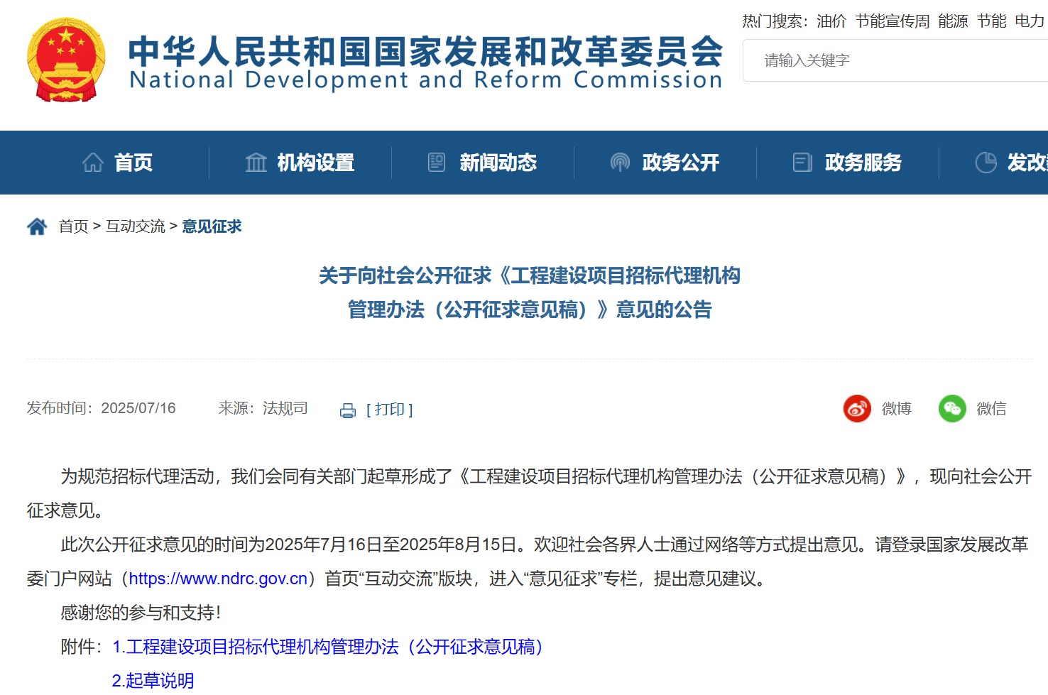 為規(guī)范招標(biāo)代理活動,國家發(fā)展和改革委員會會同有關(guān)部門起草形成了《工程建設(shè)項目招標(biāo)代理機(jī)構(gòu)管理辦法(公開征求意見稿)》,現(xiàn)向社會公開征求意見。此次公開征求意見的時間為2025年7月16日至2025年8月15日。